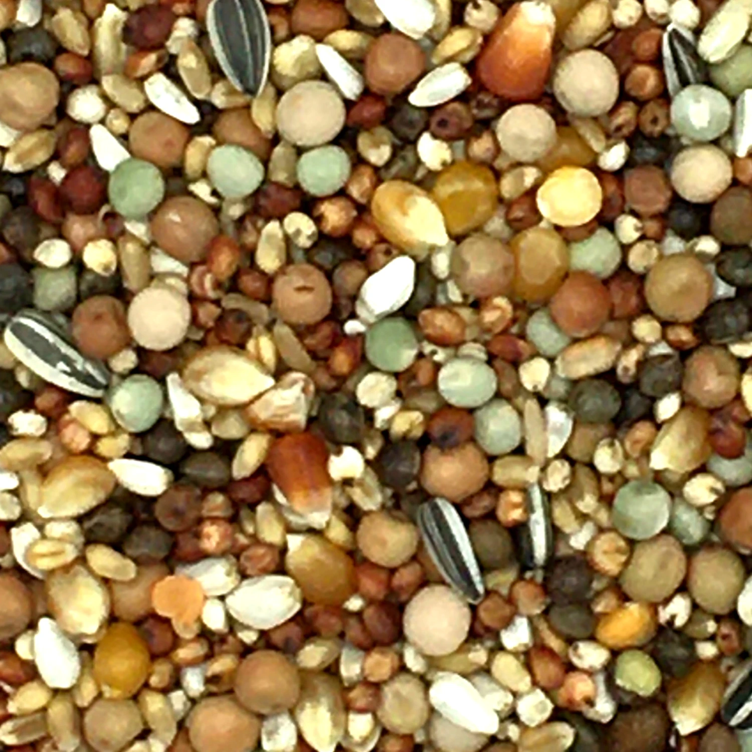 Weizen weiß 20%, Dunpeas 14%, Milo Extra 12%, Dari 12%, Popcorn-Mais 8%, Wicken 6%, Erbsen grün klein 6%, Kardi 5%, Sonnenblumenkerne gestreift 2%, Winterpeas 2%, Leinsamen 2%, Merano-Mais 2%, Raps 1%
