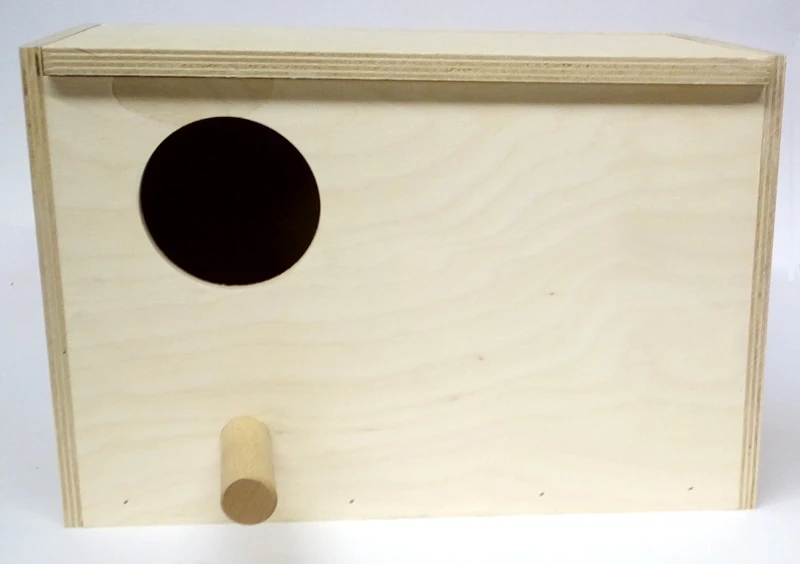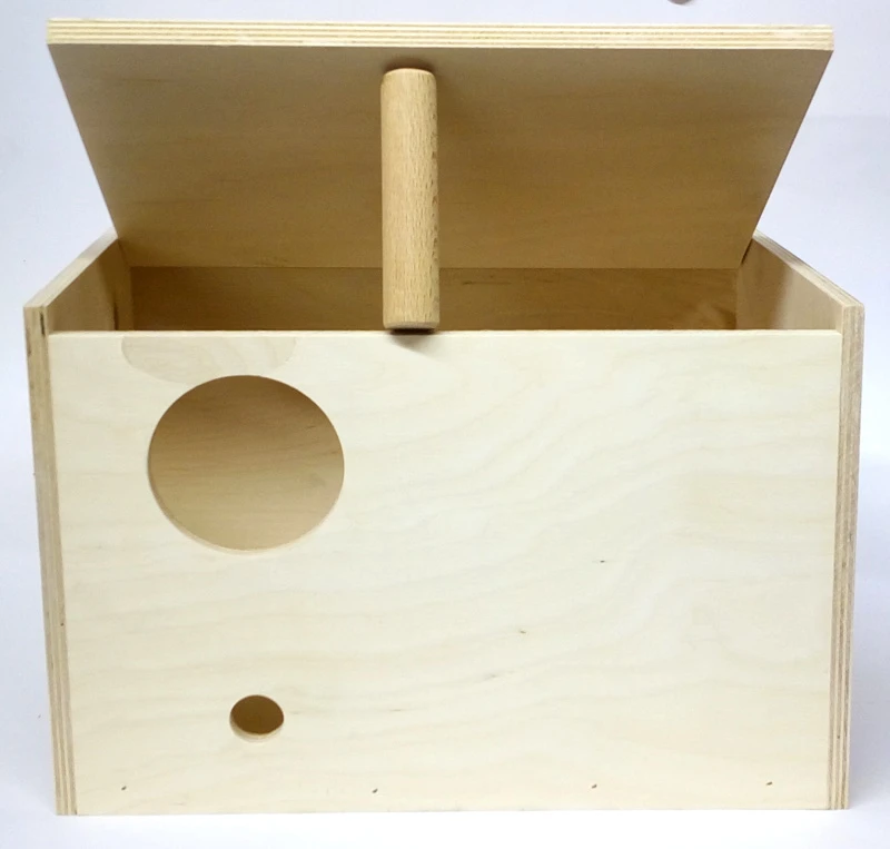 Klassischer Nistkasten aus Holz in waagerechter Ausführung. Optimal geeignet für Großsittiche und Ziervögel ähnlicher Statur. Der Klappdeckel lässt sich nach oben öffnen. Eiermulde ist vorhanden.